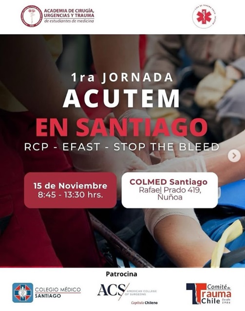 La primera Jornada ACUTEM en Santiago reúne a estudiantes y profesionales interesados en la atención del paciente politraumatizado para desarrollar destrezas esenciales y protocolos basados en evidencia. Organiza la Academia de Cirugía, Urgencias y Trauma de estudiantes de medicina (ACUTEM) con apoyo del Colegio Médico de Santiago; patrocinan el American College of Surgeons – Capítulo Chileno y el Comité de Trauma Chile. El programa combina talleres prácticos secuenciales en tres pilares del manejo inicial: ‘Stop The Bleed’ (control de hemorragias externas y uso de torniquetes), RCP de alta calidad y ecografía enfocada en trauma (EFAST) para la toma de decisiones rápida. La actividad será presencial el sábado 15 de noviembre de 2025 en COLMED Santiago (Rafael Prado 419, Ñuñoa), con horario de 08:45 a 13:30 h. Cupos limitados (35) y arancel general de $5.000 por persona. Según la última publicación, los cupos se encuentran agotados. La jornada busca fortalecer el trabajo en equipo y la respuesta organizada ante emergencias tiempo-dependientes mediante entrenamiento práctico y discusión guiada.Fecha