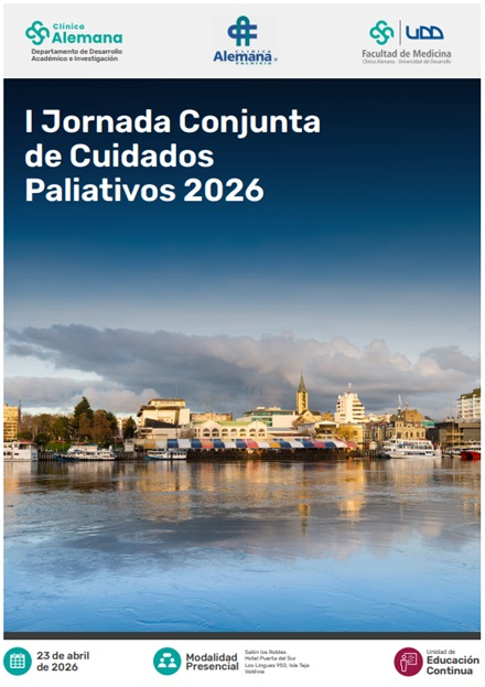 La I Jornada Conjunta de Cuidados Paliativos 2026 se realizará el 23 de abril de 2026 en Valdivia, en modalidad presencial. Su objetivo es revisar las temáticas de cuidados paliativos universales para la atención primaria, secundaria y terciaria, además de debatir cómo integrar estos cuidados dentro del continuo de atención. Está dirigida a profesionales que se desempeñan en cuidados paliativos y a equipos clínicos que atienden pacientes oncológicos y no oncológicos subsidiarios de derivación a cuidados paliativos.Fecha