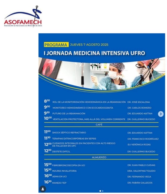 La I Jornada de Medicina Intensiva UFRO se realizará los días 07 y 08 de agosto de 2025 en el Auditorio Dr. Jaime Serra, Facultad de Medicina de la Universidad de La Frontera, de 08:00 a 17:00 hrs. El evento contará con la participación de destacados profesionales y abordará temas como perfusión y sepsis, ventilatorio, trauma y quemados, neurocríticos y misceláneos en UPC. El programa incluye conferencias sobre monitorización hemodinámica, shock séptico, terapias extracorpóreas, manejo de TEP, entre otros. Valores inscripción: Médicos $50.000, Otros profesionales $35.000, Becados $25.000. El pago se realiza vía transferencia a la cuenta corriente de la Universidad de La Frontera. Contacto: beca.medintensiva@ufrontera.clFecha