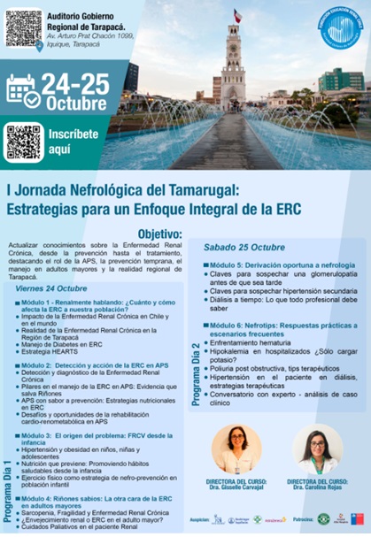 Jornada de actualización enfocada en la Enfermedad Renal Crónica (ERC), desde la prevención hasta el tratamiento, con énfasis en el rol de la Atención Primaria de Salud (APS), la pesquisa temprana, la derivación oportuna a nefrología y el abordaje práctico de escenarios clínicos frecuentes. El programa contempla dos días de trabajo (24 y 25 de octubre de 2025) con módulos sobre carga de ERC en Chile y Tarapacá, manejo de diabetes, estrategia HEARTS, diagnóstico y tratamiento de ERC en APS, nutrición y rehabilitación cardio-renometabólica, riesgos y cuidados en adultos mayores (sarcopenia, fragilidad, cuidados paliativos), así como ‘nefrotips’ útiles para hematuria, hipokalemia, poliuria postobstructiva e hipertensión en diálisis. Dirigen la jornada la Dra. Gisselle Carvajal y la Dra. Carolina Rojas. Organiza Fundación Educación Renal Chile, con el auspicio de Boehringer Ingelheim y Novo Nordisk. Actividad dirigida a médicos generales y especialistas, equipos APS y otros profesionales de la salud interesados en la prevención y el manejo integral de la ERC.Fecha