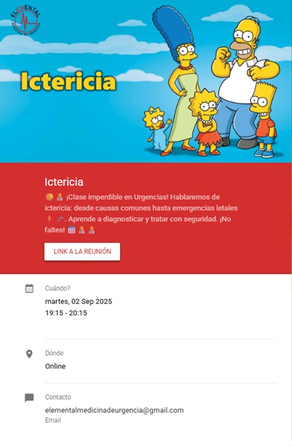 Clase de urgencias enfocada en ictericia: desde causas frecuentes hasta escenarios de alto riesgo. Sesion online por Google Meet. Se revisaran claves para el diagnostico diferencial y el tratamiento seguro en el servicio de urgencia. Organiza Elemental Medicina de Urgencia.Fecha