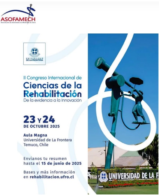 Este congreso tiene como propósito fomentar la integración de avances científicos, clínicos y tecnológicos en el ámbito de la rehabilitación, promoviendo el intercambio interdisciplinario de conocimientos y experiencias entre profesionales, académicos y estudiantes. Busca estimular la discusión de evidencia y la aplicación de tecnologías avanzadas en el área. Inscripciones: Estudiante de pre-postgrado: $48.000; Profesional Clínico: $60.000; Académico/Investigador: $60.000. Presidenta Comité Organizador: Barbara Burgos Mansilla. Presidente Comité Científico: Claudio Bascour Sandoval. Lugar: Aula Magna, Universidad de La Frontera, Temuco, Chile. Fechas: 23 y 24 de octubre de 2025.Fecha