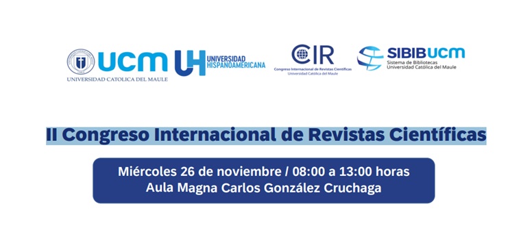 El II Congreso Internacional de Revistas Científicas (CIR 2025) convoca a editores, investigadores, bibliotecarias y profesionales de la comunicación científica para compartir tendencias y buenas prácticas. Organizado por la Universidad Católica del Maule junto al SIBIB UCM y la Universidad Hispanoamericana, se realizará los días 26 y 27 de noviembre de 2025 en el Aula Magna Carlos González Cruchaga (Talca, Chile). El programa aborda comunicación científica, integración de Inteligencia Artificial en procesos editoriales, análisis bibliométrico, calidad y políticas editoriales, metadatos, rol de las bibliotecas y administración de plataformas. Considera charlas magistrales, paneles, feria de proveedores y espacios de intercambio orientados a fortalecer la excelencia editorial y la ciencia abierta en Latinoamérica.Fecha
