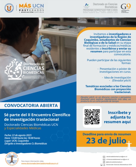 El Programa de Doctorado en Ciencias Biomédicas de la Universidad Católica del Norte, en conjunto con las Especialidades Médicas, convoca al II Encuentro Científico de Investigación Traslacional. La jornada se realizará el jueves 22 de agosto de 2025 entre las 14:00 y 18:00 horas en la Facultad de Medicina UCN, sede Coquimbo. El objetivo es articular a investigadores, profesionales de la salud y estudiantes avanzados de la región para impulsar proyectos colaborativos que conecten la investigación con necesidades clínicas y de salud pública, generando soluciones basadas en evidencia para el diagnóstico, tratamiento y seguimiento de patologías prevalentes. Modalidades de participación: 1) investigaciones en curso mediante presentación oral o póster; 2) ideas de investigación en formato elevator pitch (exposición breve de 3 minutos). Se dispondrá de 8 cupos para orales, entre 10 y 20 para pósteres y 5 para pitches. Las propuestas deben abordar temáticas propias de las Ciencias Biomédicas con proyección traslacional. La postulación se realiza completando el formulario indicado en la página del evento. Fecha límite para envío de resúmenes: 30 de julio de 2025.Fecha