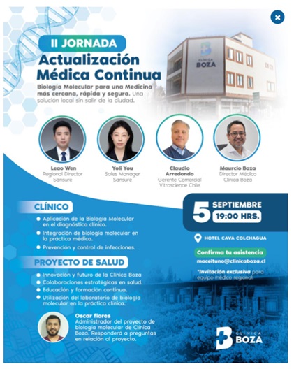 La II Jornada de Actualización Médica Continua se centra en el aporte de la biología molecular para una medicina más cercana, rápida y segura, ofreciendo a los equipos clínicos una solución local sin salir de la ciudad. La actividad reunirá a especialistas de Sansure y Vitosciencia Chile junto al equipo de Clínica Boza para revisar el uso de técnicas moleculares en el diagnóstico clínico, su integración a la práctica diaria y las estrategias de prevención y control de infecciones. Además, se presentará el proyecto de salud de Clínica Boza, que incluye la visión de futuro del centro, alianzas estratégicas, un plan de educación continua y la instalación y utilización del laboratorio de biología molecular en la práctica clínica. La sesión considera un espacio para preguntas y conversación sobre el desarrollo del proyecto institucional. La jornada está dirigida a profesionales médicos del ámbito regional y requiere confirmación de asistencia por correo electrónico. Es una invitación exclusiva para el equipo médico regional, con enfoque práctico y actualización rápida mediante presentaciones breves y orientadas a decisiones clínicas.Fecha