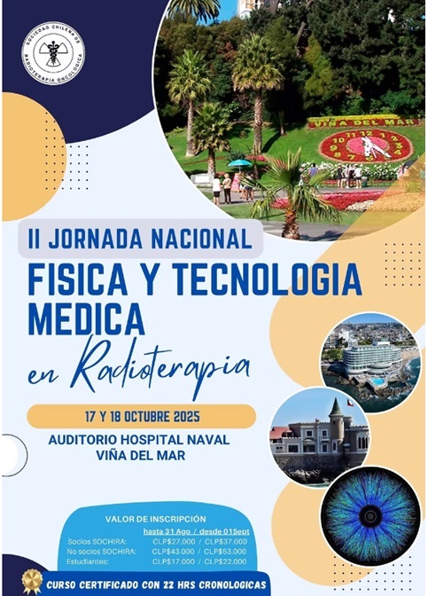 Jornadas de SOCHIRA en Viña del Mar enfocadas en Física y Tecnología Médica aplicadas a Radioterapia. Incluye actualización en radiómica, IA en autocontorneo, QA con impresión 3D, fusiones deformables, radiocirugía y técnicas avanzadas (TBI, TMI/TMLI, craneoespinal en VMAT, radioterapia a piel). Evento certificado con 22 horas cronológicas. Revisa inscripción y detalles en el enlace oficial.Fecha