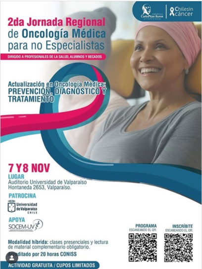 La II Jornada Regional de Oncología Médica para no Especialistas se realizará los días 7 y 8 de noviembre de 2025 en el Auditorio de la Universidad de Valparaíso (Hontaneda 2653), en Valparaíso, Chile, con modalidad híbrida (clases presenciales y lectura de material online obligatorio). La actividad está dirigida a profesionales de la salud, alumnos y becados, y ofrece actualización práctica en prevención, diagnóstico y tratamiento del cáncer, con foco en el rol del no especialista en la ruta asistencial. El programa aborda generalidades del cáncer, opciones terapéuticas actuales, nutrición del paciente oncológico, urgencias oncológicas, toxicidades de tratamiento, cribado y diagnóstico oportuno en colon, cáncer gástrico, consejería genética, y sesiones específicas sobre tiroides, pulmón, piel, mama, próstata y ginecología oncológica; además de panoramas sobre la situación del cáncer en Chile, red oncológica regional y una mesa redonda ampliada. La actividad es gratuita (cupos limitados) y entrega certificación de 20 horas pedagógicas. Inscripción mediante el código QR del afiche y contacto vía econtinuamed@udec.cl. Patrocinan la Universidad de Valparaíso y SOMECMU/UV.Fecha