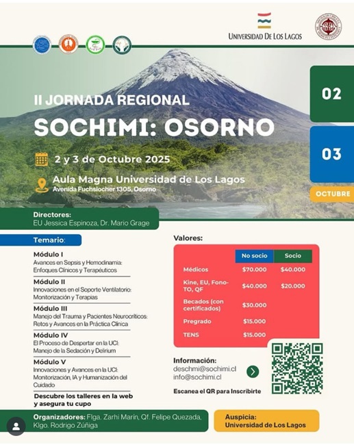 Encuentro regional de cuidados intensivos organizado por SOCHIMI en Osorno. Se revisarán avances clínicos y terapéuticos en sepsis y hemodinamia, innovaciones en soporte ventilatorio, trauma y paciente neurocrítico, manejo de sedación/delirium y monitorización, IA y humanización del cuidado en UCI.Fecha