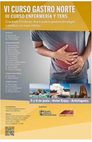 III CURSO ENFERMERÍA Y TENS Cruzando Fronteras: Acercando la gastroenterología a médicos no especialistas Directores: Dr. Gonzalo Leal Dr. Alejandro Villalón Dra. Kenia Orellana Invitados Nacionales: Dr. Javier Chahuán Dr. José Ignacio Gran Dr. Mauricio Díaz Dr. Jaime Poniachik Dr. José Ignacio Vargas Dra. Blanca Norero Dra. Camila Estay Dra. Lorena Castro Dra. Paulina Toledo Dr. Christian von Mühlenbrock Nut. Alejandra Parada Eu. Carolina Molina Eu. Nicole Pacheco Eu. Constanza Castellón Invitados Gastro Norte: Dr. Oscar Corsi Dr. Sergio Ledesma Invitados Locales: Dr. Nasser Eluzen Dra. Claudia Rojo Dr. Franco Bortolameoli Eu. Bárbara Yáñez Eu. Nathalie Allendes 5 y 6 de junio III CURSO ENFERMERÍA Y TENS Cruzando Fronteras: Acercando la gastroenterología a médicos no especialistas Directores: Dr. Gonzalo Leal Dr. Alejandro Villalón Dra. Kenia Orellana Invitados Nacionales: Dr. Javier Chahuán Dr. José Ignacio Gran Dr. Mauricio Díaz Dr. Jaime Poniachik Dr. José Ignacio Vargas Dra. Blanca Norero Dra. Camila Estay Dra. Lorena Castro Dra. Paulina Toledo Dr. Christian von Mühlenbrock Nut. Alejandra Parada Eu. Carolina Molina Eu. Nicole Pacheco Eu. Constanza Castellón Invitados Gastro Norte: Dr. Oscar Corsi Dr. Sergio Ledesma Invitados Locales: Dr. Nasser Eluzen Dra. Claudia Rojo Dr. Franco Bortolameoli Eu. Bárbara Yáñez Eu. Nathalie Allendes 5 y 6 de junio Hotel Enjoy – AntofagastaFecha