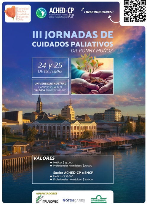 La Asociación Chilena para el Estudio del Dolor y Cuidados Paliativos (ACHED-CP) y la Sociedad Médica de Cuidados Paliativos (SMCP) invitan a las III Jornadas de Cuidados Paliativos Dr. Ronny Muñoz, tituladas “Cuidados Paliativos y Rehabilitación en Oncología: Un Enfoque Multiprofesional e Integral”. La actividad se realizará de forma presencial en la Universidad Austral de Chile, Campus Isla Teja, Valdivia, con sesiones el viernes 24 de 08:00 a 17:30 y el sábado 25 de 08:00 a 13:00. El objetivo es fortalecer el abordaje interdisciplinario de personas con cáncer avanzado, promoviendo una atención digna, humanizada y centrada en la persona. El programa incluye manejo del dolor complejo, rehabilitación funcional, comunicación con pacientes y familias, actualización farmacológica, vías de administración, mesas redondas y talleres multiprofesionales. La jornada cuenta con certificación de la SMCP y cupos limitados; se recomienda inscribirse a la brevedad.Fecha