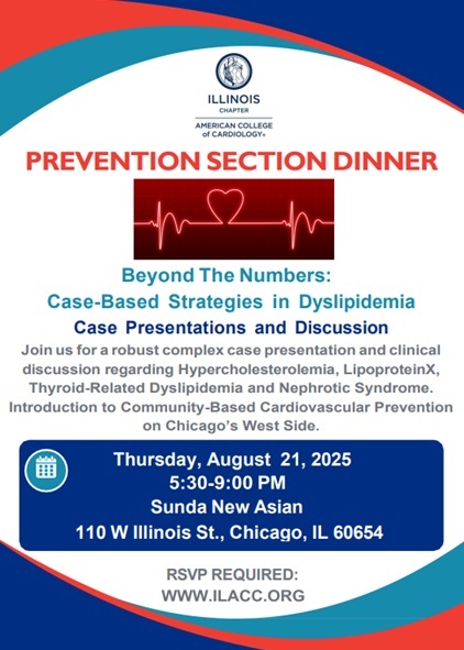 PREVENTION SECTION DINNER Beyond The Numbers: Case-Based Strategies in Dyslipidemia Join us for a robust complex case presentation and clinical discussion regarding: - Hypercholesterolemia - LipoproteinX - Thyroid-Related Dyslipidemia - Nephrotic Syndrome Featuring an introduction to Community-Based Cardiovascular Prevention on Chicago's West Side. This event will provide valuable insights into complex dyslipidemia cases and community-based prevention strategies.Fecha