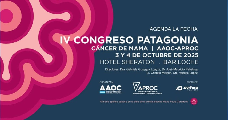 El IV Congreso Patagonia Cáncer de Mama AAOC-APROC se llevará a cabo los días 3 y 4 de octubre de 2025 en el Hotel Sheraton de Bariloche. El evento está dirigido por la Dra. Gabriela Guaygua Loayza, Dr. José Mauricio Peñaloza, Dr. Cristian Micherí y Dra. Vanesa López. Organizan: Asociación Argentina de Oncología Clínica (AAOC) y Asociación Patagónica de Radiólogos y Oncólogos Clínicos (APROC). Produce: Surface Travel OPC.Fecha