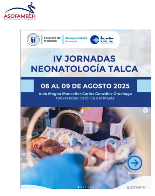 Las IV Jornadas de Neonatología del Maule se realizarán del 6 al 9 de agosto de 2025 en el Aula Magna Monseñor Carlos González Cruchaga de la Universidad Católica del Maule. El evento contará con expositores de alto nivel nacional, referentes en el área pediátrica y neonatal, quienes presentarán las últimas actualizaciones para fortalecer el trabajo de los equipos de salud. Es un espacio clave para compartir conocimientos, fortalecer redes y mejorar el manejo de patologías prevalentes en neonatología. Para consultas: facultadmedicina@ucm.clFecha