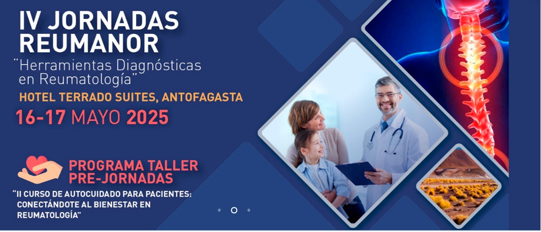 IV Jornadas Reumanor “Herramientas Diagnósticas en Reumatología” Hotel Terrado Suites, Antofagasta 16 – 17 mayo 2025 Programa Taller Pre-Jornadas “II Curso de autocuidado para pacientes: conectándote al bienestar en Reumatología” La Filial Norte de SOCHIRE (REUMANOR) los invita a participar de un nuevo curso: IV Jornadas REUMANOR, “Herramientas Diagnósticas en Reumatología” a dictarse en el Hotel Terrado Suits, Antofagasta los días 16 y 17 de mayo, 2025. Curso que contará con un PROGRAMA TALLER PRE-JORNADAS: “II CURSO DE AUTOCUIDADO PARA PACIENTES: CONECTÁNDOTE AL BIENESTAR EN REUMATOLOGÍA” el 16 de mayo AM.Fecha