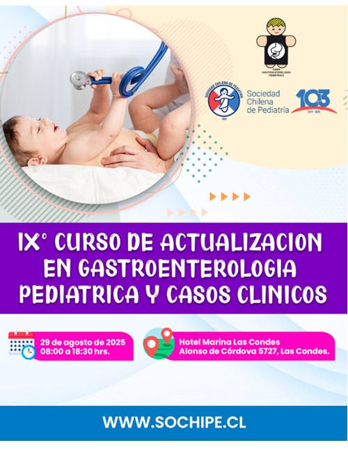 El IX° Curso de Actualización en Gastroenterología Pediátrica y Casos Clínicos SOCHIPE es una jornada presencial el 29 de agosto de 2025, en el Hotel Marina Las Condes, Santiago. El evento está dirigido a médicos, especialistas y profesionales de la salud, e incluye actualización en manejo de trastornos digestivos, disfagia, constipación, casos clínicos interactivos, esofagitis, Crohn, Helicobacter pylori, obesidad pediátrica y nutrición. Incluye discusión de casos clínicos y espacios para preguntas con especialistas reconocidos.Fecha