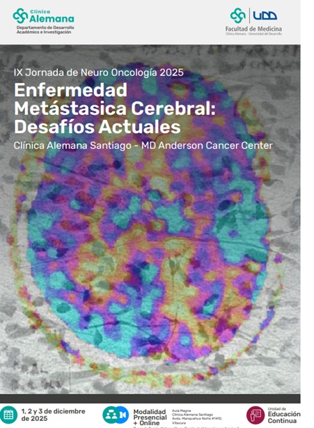La IX Jornada de Neuro Oncología 2025, organizada por Clínica Alemana Santiago en conjunto con el MD Anderson Cancer Center, abordará los desafíos actuales de la enfermedad metastásica cerebral con un enfoque multidisciplinario. Durante tres días (1–3 de diciembre de 2025) se revisarán avances en neurocirugía, radioterapia preoperatoria y braquiterapia; novedades en diagnóstico por imágenes; manejo sistémico en cáncer de pulmón, mama y melanoma con metástasis cerebrales; deterioro cognitivo y rehabilitación; metástasis leptomeníngea; y técnicas como LITT. El programa combina sesiones teóricas (con opción online) y talleres presenciales de aplicabilidad y discusión de casos en grupos reducidos. Participan destacados especialistas internacionales del MD Anderson (EE.UU.) y equipos de Clínica Alemana (Neurocirugía, Oncología, Neurología y Psiquiatría, Imágenes), con patrocinio de sociedades científicas chilenas. La sede es el Aula Magna de Clínica Alemana (Vitacura), con traducción simultánea. Se ofrecen valores diferenciados para general, sociedades patrocinadoras, staff CAS-CAT-HPH y residentes/otros profesionales, además de inscripciones online para regiones y participantes internacionales. Actividad dirigida a neurocirujanos, neurólogos, neurorradiólogos, radiooncólogos, oncólogos, anatomopatólogos, psicólogos, neuropsicólogos, enfermeras y equipos afines.Fecha