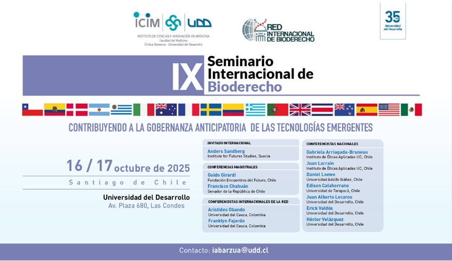 La Red Internacional de Bioderecho y la UDD celebran 10 años con el IX Seminario Internacional de Bioderecho “Contribuyendo a la Gobernanza Anticipatoria de las Tecnologías Emergentes”. Actividad GRATUITA y presencial en Santiago (UDD, Av. Plaza 680, Las Condes). Fechas: 16–17 de octubre de 2025, 09:00–17:00 h.Fecha