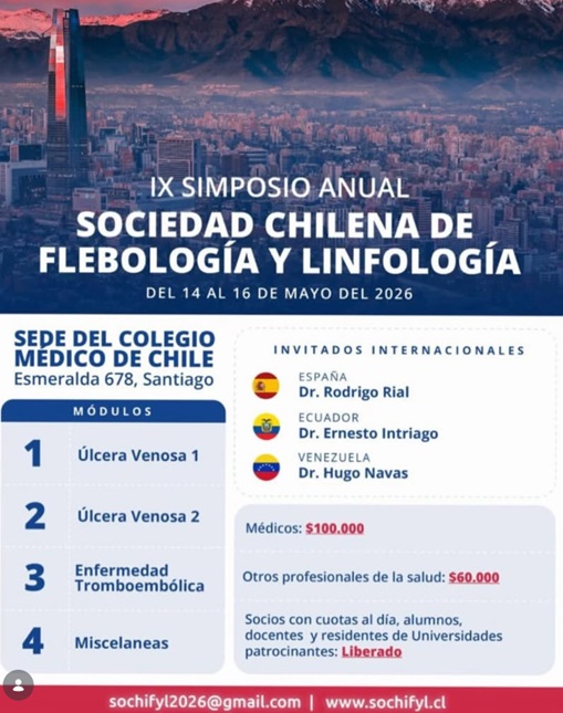 El IX Simposio Anual de la Sociedad Chilena de Flebología y Linfología se desarrollará del 14 al 16 de mayo de 2026 en Santiago y corresponde a una de las principales instancias de actualización del año en flebología y linfología. La actividad contempla curso precongreso, sesiones temáticas sobre úlcera venosa y enfermedad tromboembólica, además de talleres prácticos en compresión, lipedema y linfedema. El encuentro reunirá a referentes internacionales en cirugía vascular, flebología y procedimientos mínimamente invasivos, integrando teoría, discusión clínica y entrenamiento práctico.Fecha