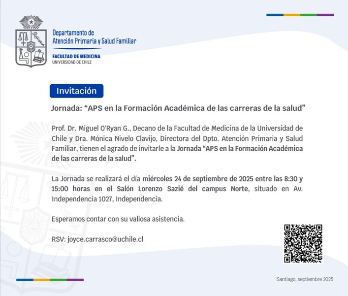 La Facultad de Medicina de la Universidad de Chile, a través del Departamento de Atención Primaria y Salud Familiar, invita a la jornada “APS en la Formación Académica de las carreras de la salud”, instancia que busca reforzar el rol de la Atención Primaria de Salud como eje formativo transversal de pregrado y posgrado. El encuentro será el miércoles 24 de septiembre de 2025, entre las 08:30 y 15:00 horas, en el Auditórium ‘Dr. Lorenzo Sazié’ (Campus Norte), ubicado en Av. Independencia 1027, Independencia, Santiago. Participarán autoridades académicas y equipos docentes para dialogar sobre integración curricular de la APS, campos clínicos y prácticas comunitarias, interprofesionalidad, innovación docente, investigación aplicada y vinculación con el territorio. La actividad está dirigida a académicos/as, estudiantes y profesionales interesados en fortalecer la formación con enfoque familiar y comunitario. Las inscripciones y el programa oficial están disponibles en el sitio de la Facultad. Contacto: joyce.carrasco@uchile.cl.Fecha
