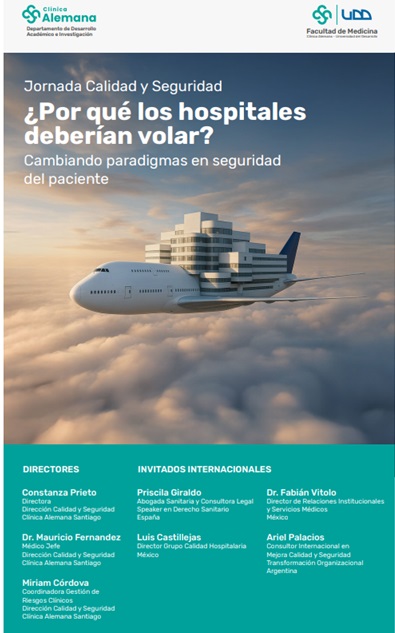 Encuentro académico con modalidad híbrida (presencial + transmisión) orientado a gestores de calidad y seguridad, profesionales de instituciones de salud y estudiantes afines. Bajo el lema “¿Por qué los hospitales deberían volar? ”, la jornada propone cambiar paradigmas en seguridad del paciente mediante una visión innovadora de cultura organizacional, aprendizaje y mejora continua. Se abordarán herramientas prácticas para fortalecer la seguridad clínica y la calidad asistencial: gestión integral de riesgos, liderazgo, cultura justa, sistemas de gestión basados en ISO 7101, simulación clínica como “cabina de vuelo”, seguridad diagnóstica, safety walk-rounds y estrategias de comunicación y disculpa del error. El programa convoca a directores e invitados internacionales y nacionales con amplia experiencia en mejora de procesos, transformación cultural y educación basada en simulación. Sede presencial: Aula Magna, Clínica Alemana Santiago (Vitacura), los días 9 y 10 de septiembre de 2025. Actividad gratuita.Fecha
