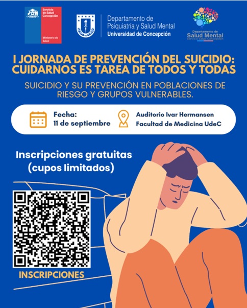 Jornada de capacitación para profesionales de salud sobre prevención del suicidio, dirigida a contextos y grupos de riesgo. Actividad presencial en el Auditorio Ivar Hermansen de la Facultad de Medicina UdeC, con bloques AM y PM, mesas de preguntas e inscripción gratuita (cupos limitados).Fecha