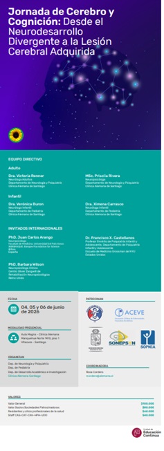 La Jornada de Cerebro y Cognición: Desde el Neurodesarrollo Divergente a la Lesión Cerebral Adquirida se realizará los días 4, 5 y 6 de junio de 2026 en modalidad presencial en el Aula Magna de Clínica Alemana, en Vitacura, Santiago. El simposio busca promover el intercambio de conocimientos actualizados sobre neurodivergencias, daño cerebral y farmacoterapia desde una perspectiva interdisciplinaria. El programa analiza el impacto funcional, emocional y social del tratamiento farmacológico en personas con TEA, TDAH y lesiones cerebrales, visibiliza la experiencia de pacientes y familias en diagnóstico, intervención y rehabilitación, y fomenta redes clínicas y académicas con prácticas basadas en evidencia y participación.Fecha