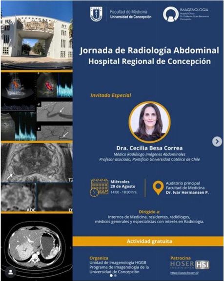 Jornada de Radiología Abdominal del Hospital Regional de Concepción, organizada por la Unidad de Imagenología del HGGB y la Facultad de Medicina de la Universidad de Concepción. Actividad presencial, gratuita y dirigida a internos de medicina, residentes, radiólogos, médicos generales y especialistas con interés en radiología. Participa como invitada especial la Dra. Cecilia Besa Correa, radióloga de imágenes abdominales y profesora asociada de la Pontificia Universidad Católica de Chile. El programa contempla contenidos clínicos y técnicos de alta aplicabilidad: evaluación de lesiones focales hepáticas benignas, consideraciones en trasplante hepático incluyendo técnica quirúrgica y realidad local, doppler en trasplante con énfasis en arteria hepática, simuladores del cáncer pancreático y actualización en resonancia multiparamétrica de próstata. La actividad se realiza en el Auditorio Dr. Ivar Hermansen de la Facultad de Medicina UdeC. Consultas al correo drraulriquelme@gmail.com.Fecha