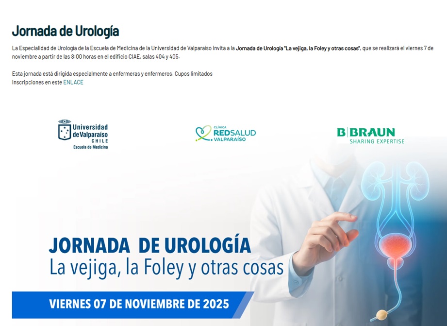 La Especialidad de Urología de la Escuela de Medicina de la Universidad de Valparaíso invita a la Jornada de Urología “La vejiga, la Foley y otras cosas”, dirigida especialmente a enfermeras y enfermeros. Se realizará el viernes 7 de noviembre de 2025, desde las 08:00 horas, en el edificio CIAE (salas 404 y 405) de la Universidad de Valparaíso, Valparaíso, Chile. La jornada aborda anatomía, fisiología, técnica y complicaciones del cateterismo vesical, prevención de infecciones y nuevas tecnologías en catéteres urinarios. Cupos limitados. Inscripciones en el enlace oficial.Fecha