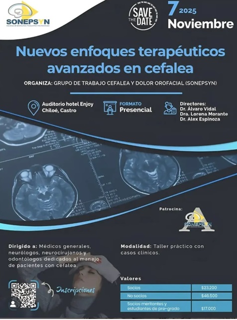 La Sociedad de Neurología, Psiquiatría y Neurocirugía de Chile (SONEPSYN), a través del Grupo de Trabajo de Cefalea y Dolor Orofacial, convoca a la jornada presencial “Nuevos enfoques terapéuticos avanzados en cefalea”, a realizarse el viernes 7 de noviembre de 2025 en el Auditorio del Hotel Enjoy, Chiloé – Castro. La actividad se enfoca en el manejo clínico y terapéutico de pacientes con cefalea, incorporando estrategias actualizadas, abordajes multimodales y revisión de evidencia para escenarios reales. El formato incluye taller práctico con discusión de casos clínicos guiada por especialistas, con énfasis en indicación racional de tratamientos, optimización del seguimiento y coordinación con odontología ante dolor orofacial. Dirigido a médicos generales, neurólogos, neurocirujanos y odontólogos. Dirección académica: Dr. Álvaro Vidal, Dra. Lorena Morante y Dr. Alex Espinoza. Patrocina SONEPSYN. Inscripción por código QR del afiche. Valores: socios $23.200; no socios $46.500; socios meritantes y estudiantes de pregrado $17.000. Cupos limitados.Fecha
