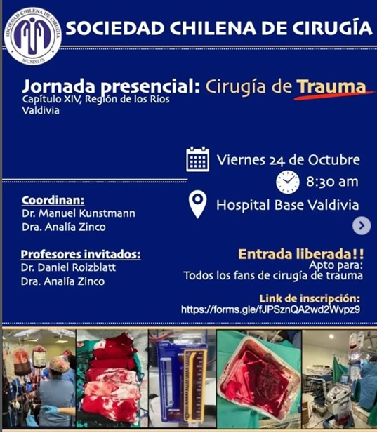 El Capítulo XIV de la Sociedad Chilena de Cirugía (Región de Los Ríos) invita a la Jornada presencial de ‘Cirugía de Trauma’, a realizarse el viernes 24 de octubre de 2025 en el Hospital Base de Valdivia. La actividad, con entrada liberada, está orientada a cirujanos, residentes y equipos quirúrgicos interesados en el abordaje del trauma. El programa considera reanimación del paciente politraumatizado, trauma cervical en urgencias y pabellón, organización del equipo ante múltiples víctimas, trauma pulmonar, laparotomía en trauma y control de daños, además de trauma de grandes vasos abdominales y discusión de casos clínicos. Coordinan el Dr. Manuel Kunstmann y la Dra. Analía Zinco; profesores invitados: Dr. Daniel Roizblatt y Dra. Analía Zinco. Inscripción en el formulario indicado en el aviso oficial.Fecha
