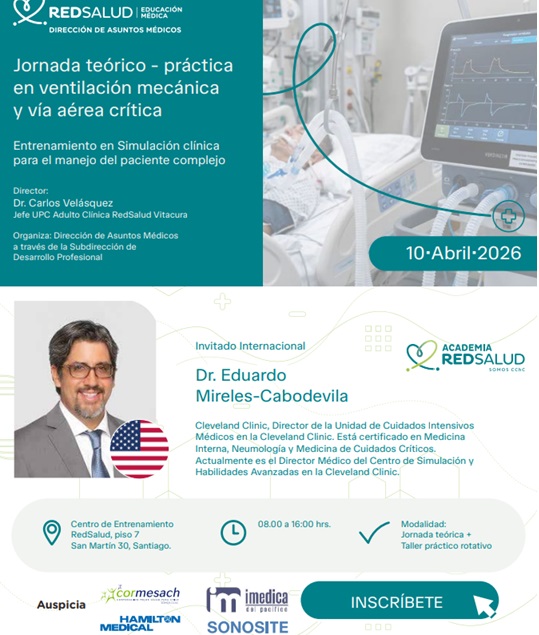 La Jornada teórico-práctica en ventilación mecánica y vía aérea crítica se realizará el 10 de abril de 2026 en Santiago, en el Centro de Entrenamiento RedSalud. La actividad considera una jornada teórica más un taller práctico rotativo con entrenamiento en simulación clínica para el manejo del paciente complejo. Incluye un invitado internacional de Cleveland Clinic y contenidos sobre presión transpulmonar, ventilación mecánica en situaciones extremas, monitorización del esfuerzo, asincronías, ECMO, herramientas digitales y talleres de vía aérea difícil, cricotirotomía, balón esofágico y ecografía pulmonar.Fecha