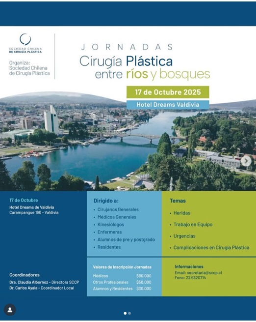Las Jornadas de Cirugía Plástica “Entre ríos y bosques” se realizarán el 17 de octubre de 2025 en el Hotel Dreams Valdivia, organizadas por la Sociedad Chilena de Cirugía Plástica. La actividad, de carácter presencial, convoca a equipos multidisciplinarios de salud para actualizar conocimientos con un enfoque práctico y colaborativo. Está dirigida a cirujanos generales, médicos generales, kinesiólogos, enfermeras, alumnos de pre y postgrado y residentes. Los ejes temáticos incluyen heridas, urgencias, trabajo en equipo y complicaciones en cirugía plástica, abordados con énfasis en la seguridad del paciente, la toma de decisiones basada en evidencia y la integración entre disciplinas. La propuesta busca acercar la especialidad a profesionales que trabajan en distintas realidades del país, fomentando redes, transferencia de experiencia y estandarización de conductas clínicas. Las jornadas cuentan con coordinación científica local y el respaldo institucional de la SCCP, ofreciendo una instancia formativa de alto impacto regional.Fecha