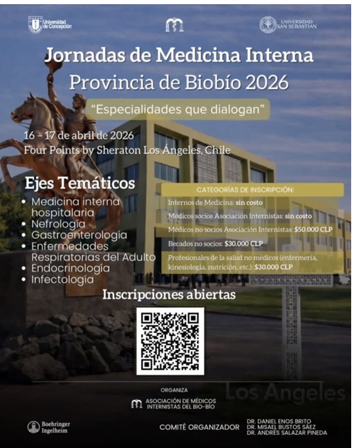 Las Jornadas de Medicina Interna Provincia de Biobío 2026 se realizarán los días 16 y 17 de abril de 2026 en modalidad presencial en el Four Points by Sheraton Los Angeles, Chile. La actividad es organizada por la Asociación de Médicos Internistas del Bio-Bio y contempla un programa académico centrado en medicina interna hospitalaria, nefrología, gastroenterología, enfermedades respiratorias del adulto, endocrinología e infectología.Fecha