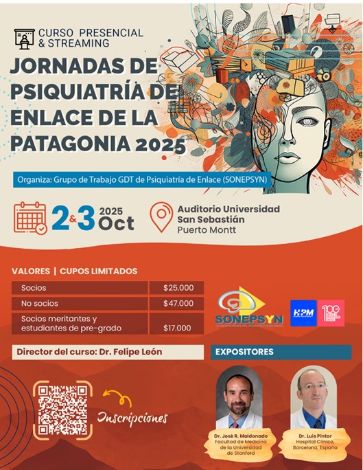 Curso presencial y streaming organizado por el Grupo de Trabajo de Psiquiatría de Enlace de SONEPSYN. Se desarrollará el 2 y 3 de octubre de 2025 en el Auditorio de la Universidad San Sebastián, Puerto Montt. El objetivo es actualizar competencias en psiquiatría de enlace para equipos clínicos hospitalarios y de urgencia, con foco en delirium, depresión en el paciente médico quirúrgico, evaluación psicosocial pretrasplante, manejo de la agitación psicomotora y emergencias psicofarmacológicas. El programa considera clases magistrales, mesas de expertos y temas aplicados como competencia para decisiones en salud, S PTD, neuroenlace y sueño, así como psiquiatría de estilo de vida y estrategias de manejo del dolor crónico no oncológico. Exponen especialistas internacionales y nacionales, incluidos José R. Maldonado y Luis Pintor. Los cupos son limitados y existen valores diferenciados para socios, no socios y estudiantes. Organiza SONEPSYN con apoyo de Universidad San Sebastián y múltiples instituciones públicas y privadas.Fecha