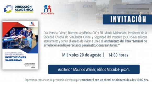 La Dirección Académica de Clínica Las Condes y la Sociedad Chilena de Simulación Clínica y Seguridad del Paciente invitan al lanzamiento del libro “Manual de simulación con bajos recursos para instituciones sanitarias”. El encuentro tendrá lugar el miércoles 20 de agosto de 2025 a las 14:00 horas, en el Auditorio 1 Mauricio Wainer, Edificio Morado F de Clínica Las Condes. Se trata de una actividad orientada a equipos clínicos, docentes y profesionales de gestión que implementan o desean implementar estrategias de simulación clínica en contextos con limitaciones presupuestarias. El texto compilatorio presenta experiencias aplicadas, lineamientos de planificación y alternativas de bajo costo para diseño de escenarios, evaluación de competencias, seguridad del paciente y mejora continua, poniendo énfasis en la adaptación de recursos y en la innovación local para la formación de pre y posgrado. La jornada comenzará con un cóctel de bienvenida a las 13:00 horas para favorecer el intercambio entre participantes y autores. Posteriormente se realizará la presentación del libro, los principales capítulos y su utilidad para unidades de simulación en hospitales, centros de salud y universidades. Actividad presencial, cupos limitados.Fecha