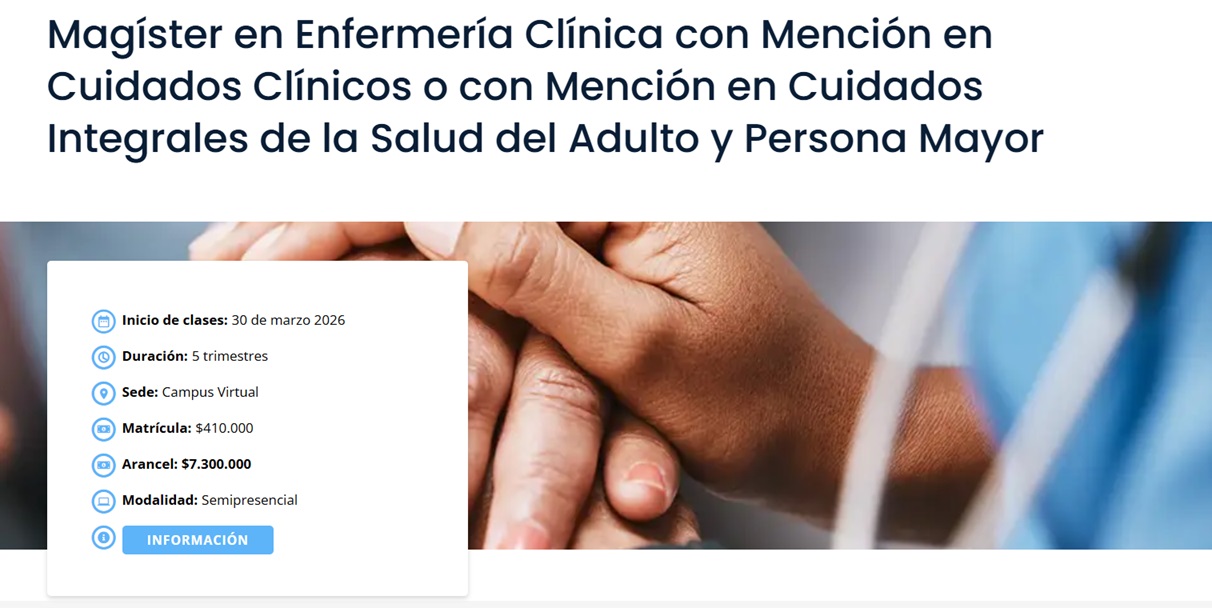 El Magíster en Enfermería Clínica con mención en Cuidados Clínicos o con mención en Cuidados Integrales de la Salud del Adulto y Persona Mayor, impartido por la Facultad de Enfermería de la Universidad Andrés Bello (UNAB), inicia clases el 30 de marzo de 2026 y tiene una duración de 5 trimestres. El programa responde a la necesidad de formar profesionales de enfermería con conocimientos avanzados en el área clínica, además de competencias de gestión y liderazgo, capaces de abordar problemáticas relevantes de instituciones sanitarias basando decisiones clínicas en evidencia científica, con énfasis en la humanización del cuidado y la innovación en la atención de salud. La modalidad combina formación online entre el primer y tercer trimestre, y actividad clínica presencial durante el cuarto y quinto trimestre. La mención Cuidados Integrales aborda el cuidado de enfermedades crónicas no transmisibles y el proceso de envejecimiento; la mención Cuidados Clínicos se orienta a la mejora de procesos clínicos hospitalarios complejos, con foco en calidad y seguridad clínica.Fecha