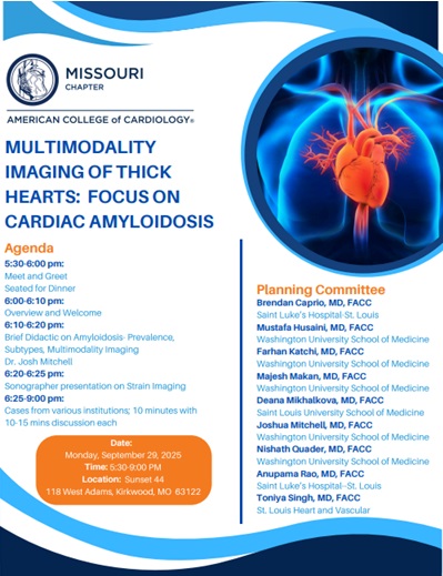 Organizado por el American College of Cardiology - Missouri Chapter, este evento se enfoca en imágenes multimodales de corazones engrosados con especial énfasis en amiloidosis cardíaca. Por qué no te lo puedes perder: - Enfoque en imágenes multimodales para amiloidosis cardíaca - Presentaciones expertas sobre prevalencia y subtipos - Técnicas de imagen de deformación (strain imaging) - Discusión de casos de varias instituciones Detalles del evento: Fecha: Lunes, 29 de septiembre de 2025 Hora: 5:30 PM - 9:00 PM Lugar: Sunset 44, 118 West Adams, Kirkwood, MO 63122Fecha