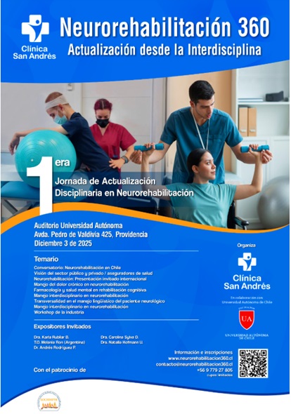 La 1ª Jornada de Actualización Disciplinaria en Neurorehabilitación (Neurorehabilitación 360) reúne a referentes clínicos y académicos para revisar tendencias, modelos de atención e intervenciones basadas en la evidencia a lo largo del continuo del cuidado. El programa contempla un conversatorio sobre la situación de la neurorehabilitación en Chile, la mirada del sector público y privado/aseguradores, experiencias internacionales invitadas, manejo del dolor crónico, farmacología y salud mental en rehabilitación cognitiva, abordajes interdisciplinarios, y enfoques transversales como el manejo lingüístico del paciente neurológico. Incluye además un workshop de la industria. Organiza Clínica San Andrés, en colaboración con la Universidad Autónoma de Chile. Actividad presencial en Providencia, Santiago, el 3 de diciembre de 2025.Fecha