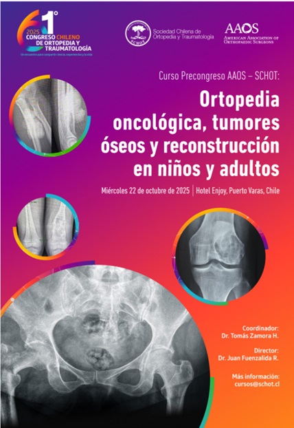 El miércoles 22 de octubre de 2025 se realizará en el Hotel Enjoy, Puerto Varas, el Curso Precongreso AAOS – SCHOT 2025 dedicado a la ‘Ortopedia Oncológica, tumores óseos y reconstrucción en niños y adultos’. La actividad —dirigida por el Dr. Tomás Zamora— busca generar un espacio de encuentro y discusión para reflexionar, aprender y proyectar en conjunto los desafíos de la oncología ortopédica y la reconstrucción. En colaboración con la American Academy of Orthopaedic Surgeons (AAOS), contará con un atractivo programa, clases teóricas y sesiones de discusión de casos clínicos, con participación de expositores nacionales e internacionales.Fecha