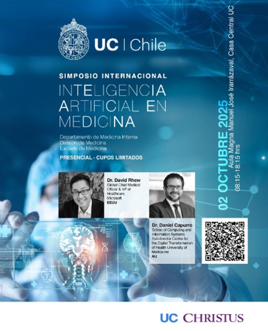 La Escuela de Medicina de la Pontificia Universidad Católica de Chile invita al Simposio Internacional de Inteligencia Artificial en Medicina, organizado por el Departamento de Medicina Interna (División de Medicina). La jornada reunirá a referentes internacionales para discutir aplicaciones clínicas y la transformación digital de los sistemas de salud. Participan el Dr. David Rhew (Global Chief Medical Officer y VP of Healthcare, Microsoft – EE.UU.) y el Dr. Daniel Capurro (School of Computing & Information Systems, Subdirector del Centre for the Digital Transformation of Health, University of Melbourne – Australia). Actividad presencial con cupos limitados, el jueves 02 de octubre de 2025, de 08:15 a 18:15 hrs, en el Aula Magna Manuel José Irarrázaval, Casa Central UC (Av. Libertador Bernardo O'Higgins 340, Santiago). Organizan Escuela de Medicina UC y Red de Salud UC CHRISTUS. Inscripción gratuita en el sitio oficial.Fecha