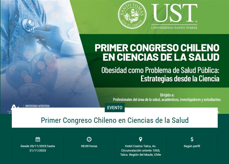 El Primer Congreso Chileno de Ciencias de la Salud: «Obesidad como Problema de Salud Pública: Estrategias desde la Ciencia» promueve un espacio de encuentro académico y científico para analizar críticamente la obesidad como uno de los principales desafíos sanitarios del país. Con una mirada interdisciplinaria, el congreso aborda los determinantes biopsicosociales que inciden en su desarrollo y persistencia, así como estrategias de prevención e intervención basadas en evidencia desde diversas áreas de las ciencias de la salud. El programa contempla conferencias inaugurales, sesiones temáticas, presentación de trabajos científicos en modalidad oral y póster, y momentos de intercambio entre investigadores, académicos, profesionales y estudiantes. Los contenidos incluyen epidemiología, nuevos criterios diagnósticos, obesidad sarcopénica, orígenes del desarrollo asociados a suplementación materna, lactancia y salud metabólica, metabolómica, uso de prebióticos y ‘diabesidad’. El evento considera acreditaciones, coffee breaks, premiación de investigaciones y un cóctel inaugural opcional. Los valores de inscripción se diferencian para público general, comunidad UST y estudiantes, con periodo de preinscripción hasta el 30 de octubre. Consultas, inscripciones y envío de trabajos al correo oficial del congreso.Fecha