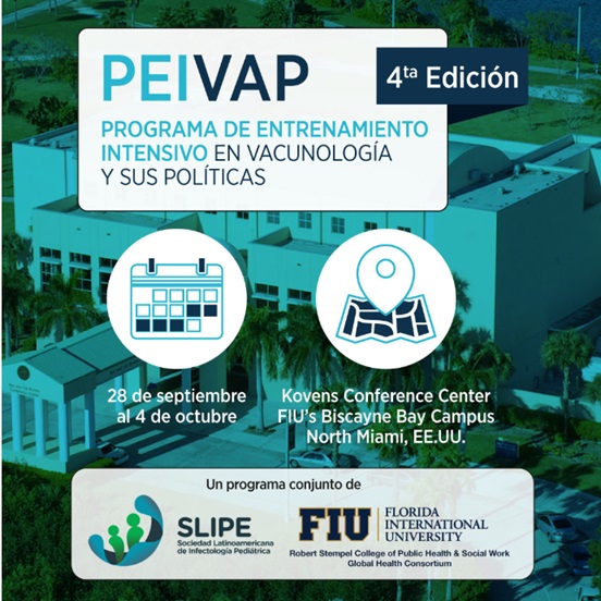 PEIVAP es un programa de entrenamiento intensivo de alta especialización en vacunología y políticas en vacunación, en idioma español. DIRIGIDO A: - Profesionales de la salud de América Latina y el Caribe - Funcionarios y tomadores de decisión de organismos públicos - Miembros de la industria farmacéutica ORGANIZAN: - Sociedad Latinoamericana de Infectología Pediátrica (SLIPE) - Florida International University (FIU) CERTIFICACIÓN: Otorgada por SLIPE y FIUFecha