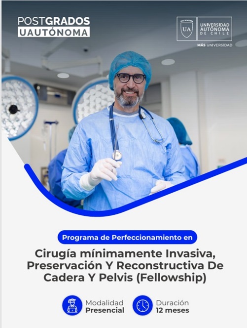 Programa de perfeccionamiento presencial (fellowship) de 12 meses orientado a médicos traumatólogos y ortopedistas con especialidad certificada, enfocado en el diagnóstico y tratamiento de patologías complejas de cadera y pelvis mediante técnicas modernas y de mínima invasión. El objetivo es formar un/a subespecialista con sólidas bases teóricas y una alta experiencia clínica y quirúrgica, capaz de estudiar, prevenir, diagnosticar y tratar patologías de cadera y pelvis con estándares de alta complejidad, y con profunda formación científica, humana y ética según el perfil de la Universidad Autónoma de Chile. La malla incluye: Anatomía de cadera y pelvis; Biomecánica y marcha; Reemplazo articular de cadera (indicación, tipos de prótesis, tribología y manejo de complicaciones); Cirugía mínimamente invasiva (artroscopia/endoscopia; abordajes intra y extraarticulares); Osteotomía periacetabular (indicaciones, contraindicaciones y complicaciones) y Rehabilitación (fases pre, posoperatoria inmediata y tardía). Requisitos de admisión: título de Médico Cirujano y Especialidad en Ortopedia y Traumatología; manejo de información científica, organización y gestión del tiempo; dominio de español escrito y hablado, e inglés académico para lectura. Documentos: ficha y formulario de postulación; certificados de grado/título (legalizados/apostillados si corresponden), cédula/pasaporte, certificado de nacimiento y CV. La sede es Santiago; el horario de clases será definido por la dirección del programa. Vacantes y condiciones son propuestas por el comité docente junto a la Dirección de Clínica, conforme al reglamento de la Escuela de Medicina.Fecha
