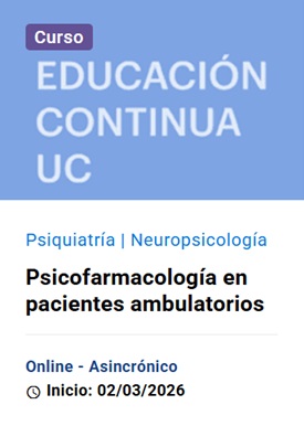Curso online asincrónico orientado a actualizar competencias en psicofarmacología práctica para el manejo ambulatorio de los trastornos psiquiátricos. A partir de una perspectiva aplicada y basada en evidencia, el programa aborda los fundamentos de farmacología clínica, la evaluación de beneficios/riesgos, efectos adversos, interacciones, indicaciones y estrategias de potenciación en situaciones reales de atención. La docencia se realiza en la plataforma LMS de Educación Continua UC mediante clases audio-grabadas, análisis de casos y revisión de bibliografía especializada. El curso está dirigido a médicos generales, psiquiatras, neurólogos, médicos de familia, residentes y otros profesionales del área de la salud que buscan fortalecer decisiones terapéuticas seguras y eficaces en consulta ambulatoria. Fecha de inicio 2 de marzo de 2026; término 10 de mayo de 2026. Carga total 80 horas (40 directas y 40 indirectas). Arancel de referencia $650.000 CLP (hasta 3 cuotas). Al finalizar se entrega certificado e insignia digital UC.Fecha