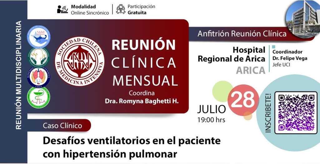 Reunión Clínica Mensual organizada por el Hospital Regional de Arica, coordinada por la Dra. Romyna Baghetti H. Tema central: - Desafíos ventilatorios en el paciente con hipertensión pulmonar Evento dirigido a profesionales de la salud interesados en el manejo de pacientes con complicaciones ventilatorias y hipertensión pulmonar.Fecha
