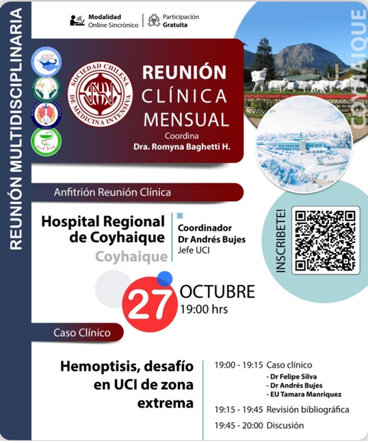 Reunión Clínica Mensual de la Sociedad Chilena de Medicina Intensiva (SOCHIMI), modalidad online sincrónica y participación gratuita. Coordina: Dra. Romyna Baghetti H. Anfitrión: Hospital Regional de Coyhaique (Coordinador: Dr. Andrés Bujes, Jefe UCI). Caso clínico: Hemoptisis, desafío en UCI de zona extrema. Programa: 19:00–19:15 Caso clínico (Dr. Felipe Silva; Dr. Andrés Bujes; EU Tamara Manríquez); 19:15–19:45 Revisión bibliográfica; 19:45–20:00 Discusión.Fecha