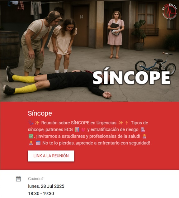 Reunión sobre SÍNCOPE en Urgencias. Se abordarán los tipos de síncope, patrones ECG y estratificación de riesgo. Invitamos a estudiantes y profesionales de la salud. No te lo pierdas, aprende a enfrentarlo con seguridad.Fecha