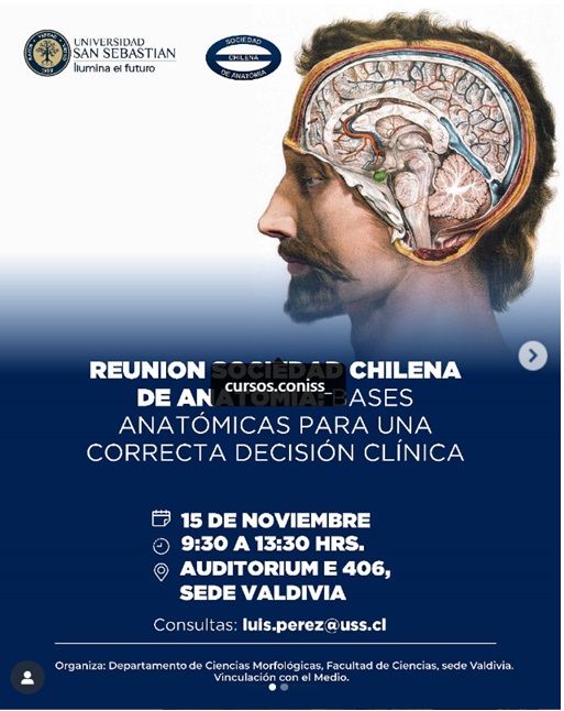 La Universidad San Sebastián, sede Valdivia, será anfitriona de la Reunión de la Sociedad Chilena de Anatomía 2025, centrada en el tema “Bases anatómicas para una correcta decisión clínica”. La jornada convoca a docentes y clínicos para revisar, mediante ponencias y análisis de casos, cómo el conocimiento anatómico actual orienta decisiones diagnósticas e intervencionistas seguras. El programa considera anatomía aplicada en cardiopatías congénitas, actualización en ITS y patología de mucosa oral, imagenología oral y maxilofacial, señalización de IL-1 y senescencia celular, además de herramientas de tomografía de haz cónico para valoración anatómica del complejo maxilofacial y evaluación del canal nasopalatino. Se busca integrar evidencia, experiencia clínica y criterios morfológicos para mejorar la toma de decisiones en distintos escenarios asistenciales. El encuentro se realiza el sábado 15 de noviembre de 2025, de 09:30 a 13:30 horas, en el Auditorium E406, campus Valdivia. Actividad organizada por el Departamento de Ciencias Morfológicas de la Facultad de Ciencias, en coordinación con Vinculación con el Medio. Consultas a luis.perez@uss.cl.Fecha