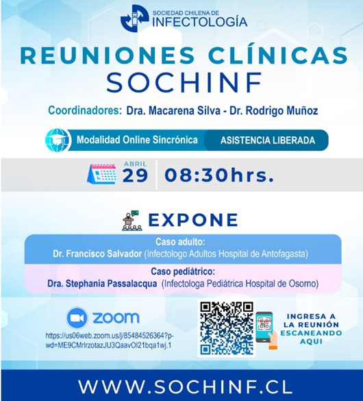 Reuniones Clínicas SOCHINF Coordinadores: Dra. Macarena Silva · Dr. Rodrigo Muñoz Modalidad online sincrónica – Asistencia liberada 📅 29 abril ⏰ 08:30 hrs. EXPONE Caso adulto: Dr. Francisco Salvador (Infectólogo Adultos, Hospital de Antofagasta) Caso pediátrico: Dra. Stephania Passalacqua (Infectóloga Pediátrica, Hospital de Osorno) 🔗 Zoom https://us06web.zoom.us/j/85484526364?pwd=ME9CMrlrozazUJ3aavO12b1q4w1 (o ingresa escaneando el QR) WWW.SOCHINF.CLFecha