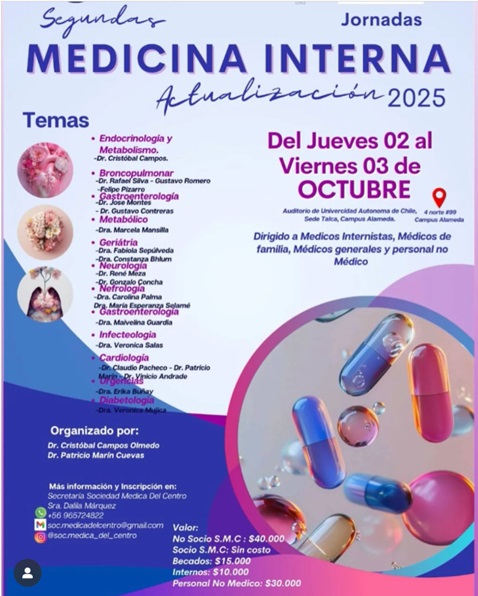 Las Segundas Jornadas de Medicina Interna Actualización 2025 ofrecen una revisión integral de las principales áreas de la medicina interna con expositores destacados en cada especialidad. Características principales: - Actualización en diversas áreas de la medicina interna - Expositores especializados en cada tema - Dirigido a médicos internistas, de familia, generales y personal no médico - Organizado por la Sociedad Médica del CentroFecha